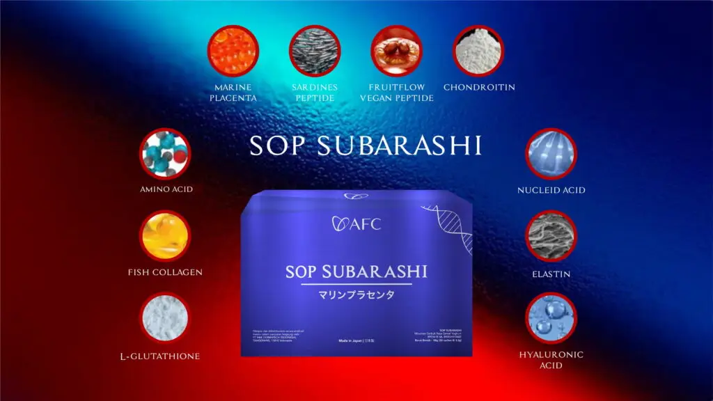 SOP Subarashi adalah Produk Triple Peptide pertama di Jepang yang memiliki ingredient utama yaitu dari Salmon Ovary Peptide dari ikan Oncorhynchus keta salmon di Hokkaido, Sarden Peptide dan Fruitflow (Vegan Peptide) dan juga 7 aktif ingredient lain.